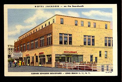 The Hotel Jackson. The movie marquee reads "MIRIAM HOPKINS in THE HEIRESS", which came out in 1949. The back of the postcard reads: HOTEL JACKSON 45 MINUTES FROM BROADWAY, CORNER EDWARDS BOULEVARD, LONG BEACH (L.I.) N.Y. CHARMING MODERN HOTEL. RESTAURANT ON THE PREMISES. ROOMS WITH AND WITHOUT KITCHENETTE. Below you will see an earlier image of the Jackson Amusement Park and the Central Turkish Baths. Transients welcome !!! At the bottom is a photo of a serious fire at the Hotel Jackson in the 1960's. |