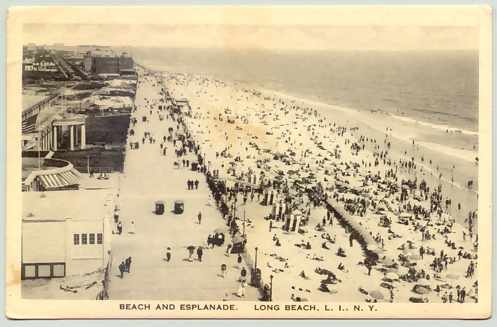 On top, you're looking east from the roof of the Hotel Nassau. In the immediate foreground on the left is the The Castle Baths building, (later the Mirimar Apts) just beyond it, with the white columns, is the Castle by the Sea dance hall. The dance hall was built by William Reynolds before his corportation when bankrupt and was originall called "Danse de la Mer" (literally, Dance of the Sea). It had the largest dance floor in the world at the time. It was renamed by the famous ballroom dancers of the day, the Castle's. It burned to the ground in the 30's. On the bottom is yet another postcard view of the Hotel Nassau, this one a little unusual because it is taken from across Broadway on the street side. The corner of the building on the lower left is most probably the Tower Baths, which burned in the 60's. |